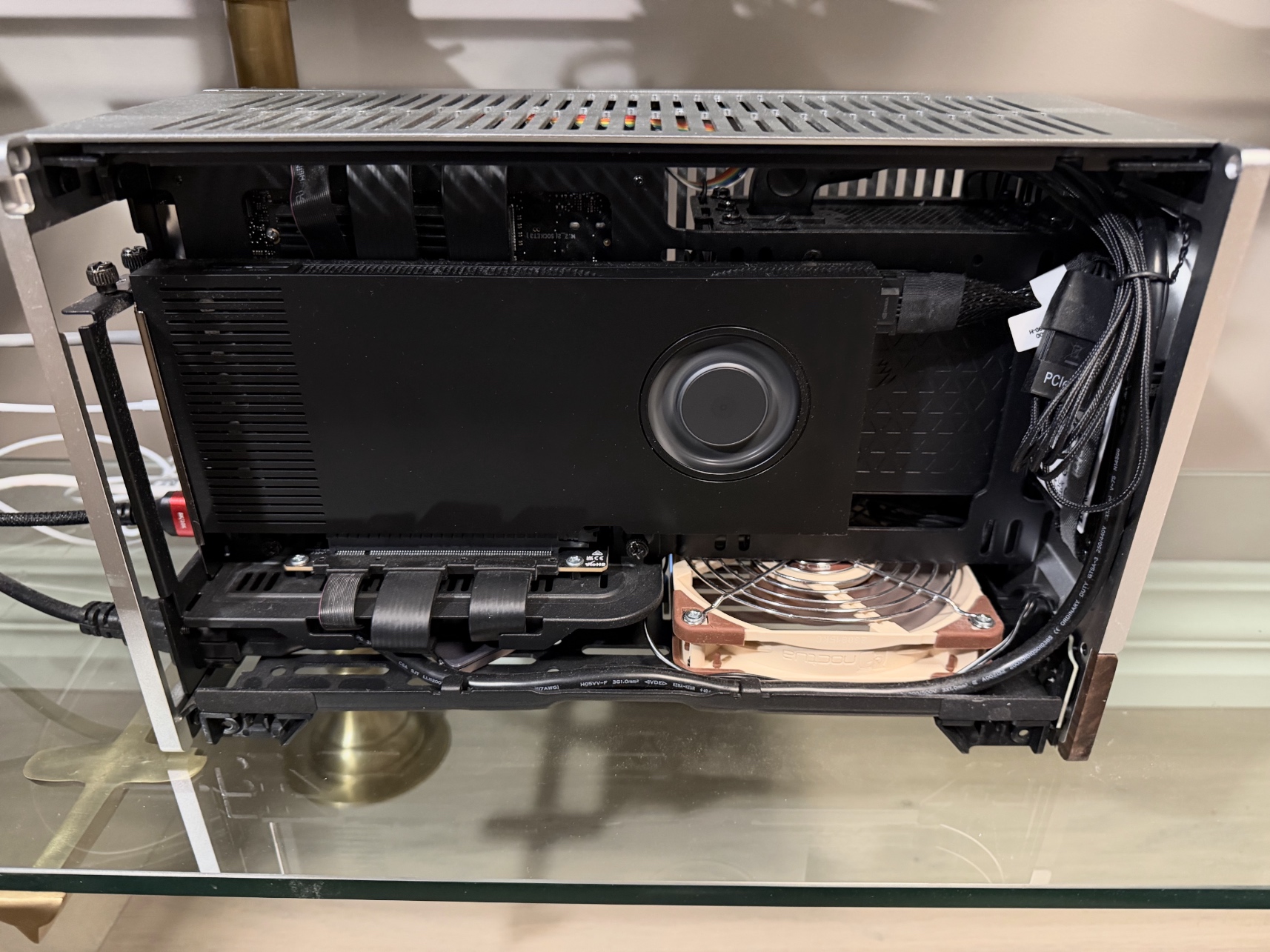 GPU-en er installert i en av våre Mini-ITX-servere (med den nydelige kassen Fractal-Design Terra) som kjører Proxmox VE. For å få maksimal ytelse har vi satt opp en Ubuntu VM med PCIe passthrough, slik at hele GPU-en dedikeres til én virtuell maskin.