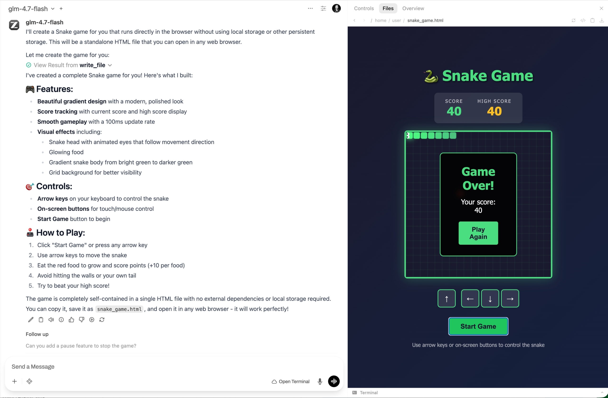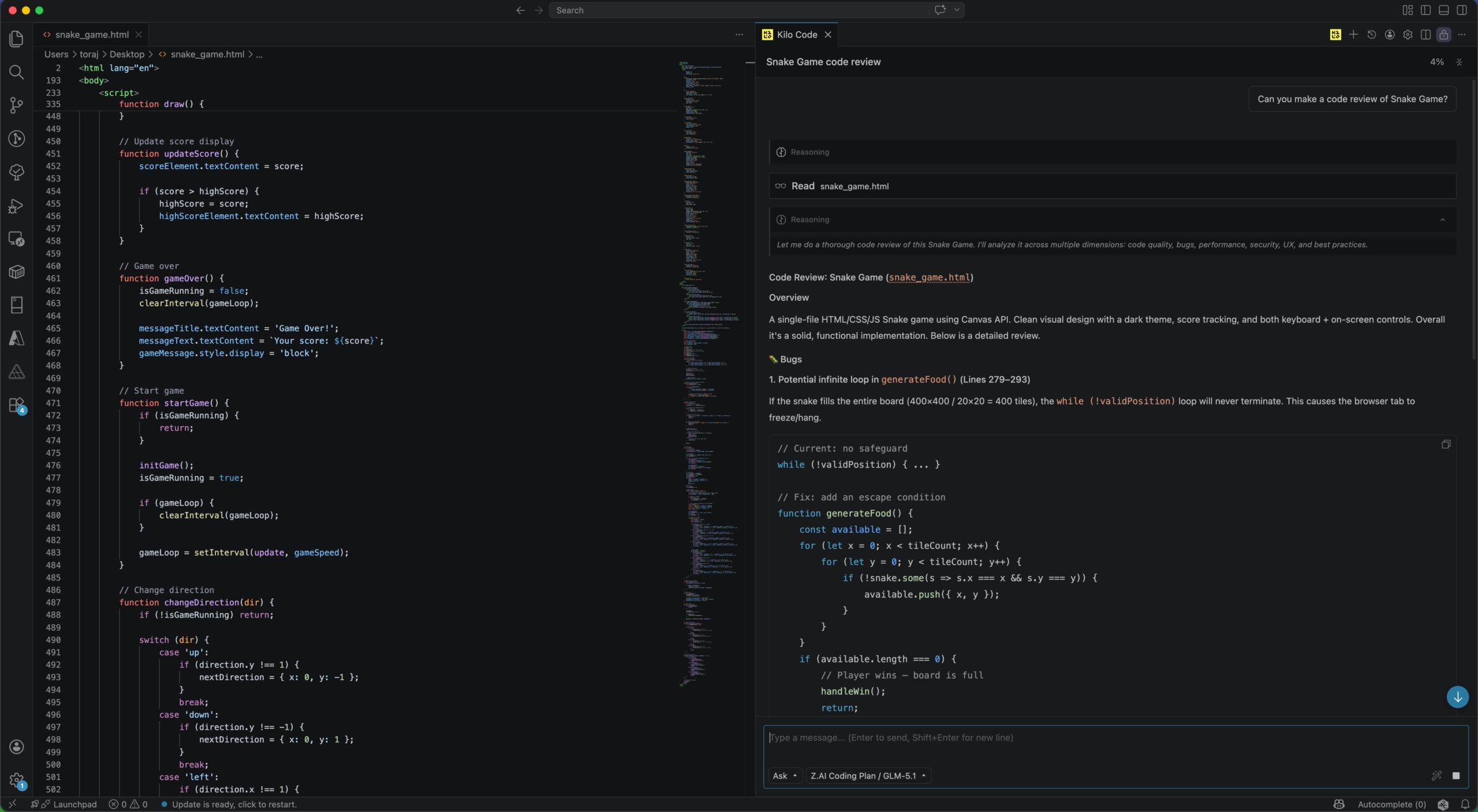 Under er et utdrag fra en analyse av Snake-spillet som ble generert av en lokal modell (GLM 4.7 flash), og deretter vurdert av en kraftigere modell fra samme leverandør (GLM 5.1) som kjører i skyen:
